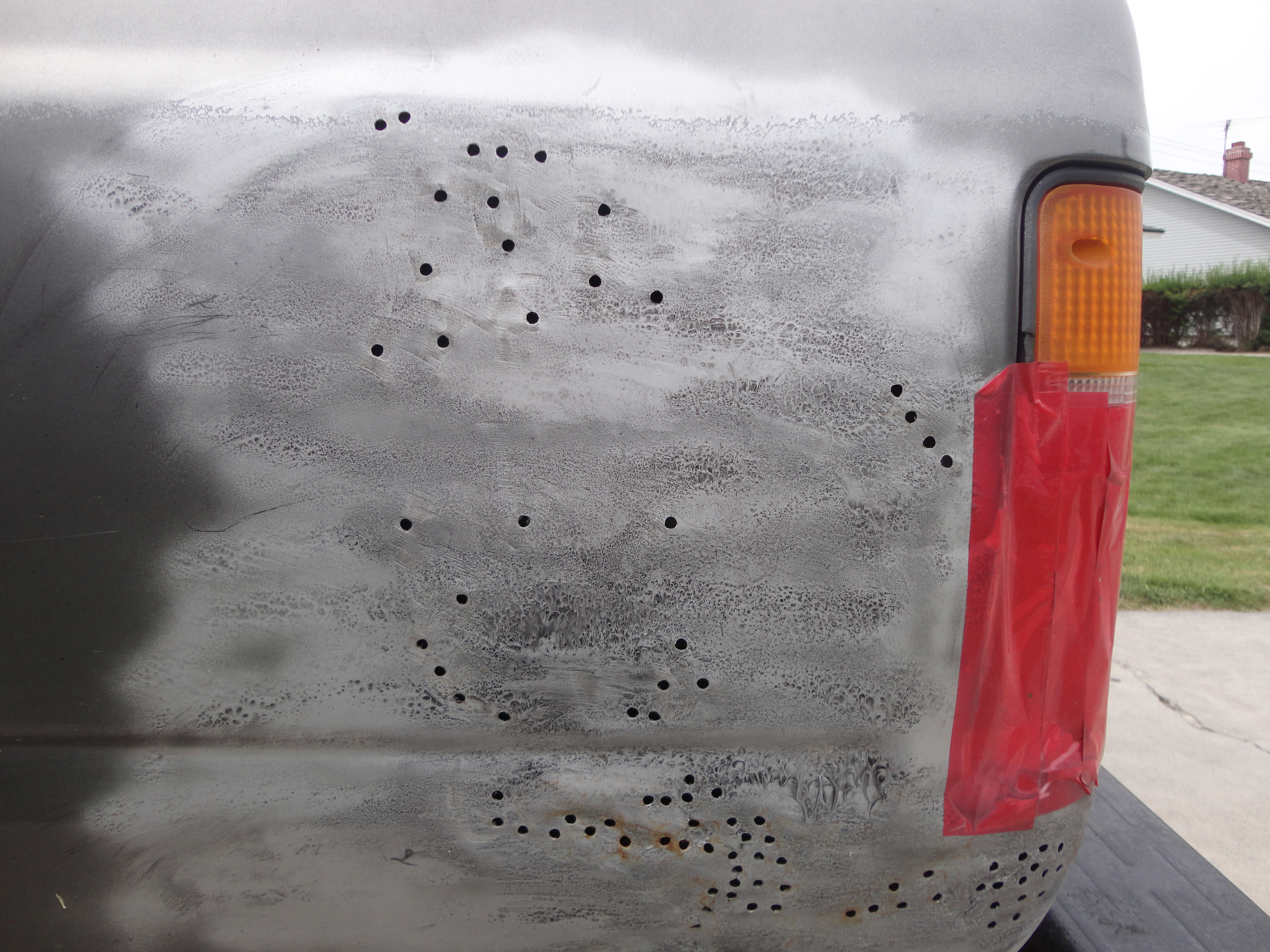 As you can see, chunks of paint and plastic decal are falling off my van to reveal sandy patches of rust.